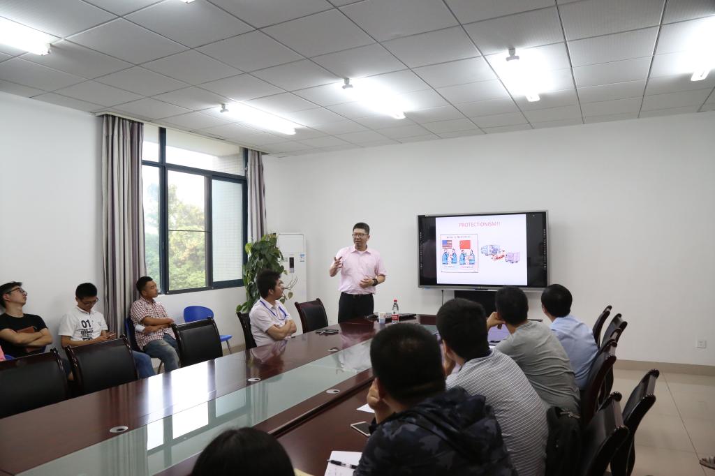 讲座围绕Asia-pacific economic cooperation(亚太经合组织,简称APEC)、Free trade(自由贸易)、Protectionism(保护主义)三个长期占据经济、国际政治领域的热门话题展开。刘心义教授分析了加强中国与亚太经合组织其他成员的双边关系、加强合作,促进互融共通,带动双边关系共同发展的重要性。刘教授指出:在经济全球化的大环境下,各国经济往来也更加密切,而国际间贸易壁垒、贸易保护主义却愈演愈烈,严重阻碍了经济全球化的进程。因此,中国与亚太经合组织其他成员更应该积极调整对外经贸政策,打破贸易壁垒,掌握经济发展的主动权,进行自由贸易,致力于建立一个可持续发展与繁荣和富有活力的共同体。