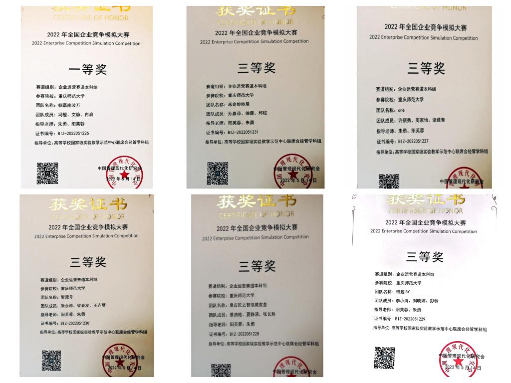 “躺赢南波万”队荣获2022年全国企业竞争模拟大赛总决赛一等奖,团队成员:冯橙、文静、冉浪,指导教师:朱勇、阳芙蓉;