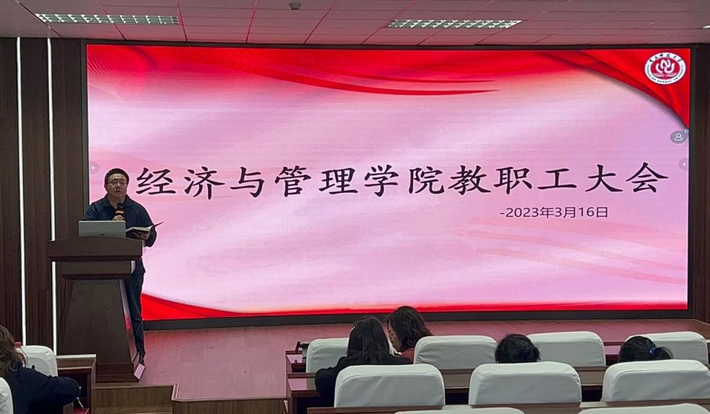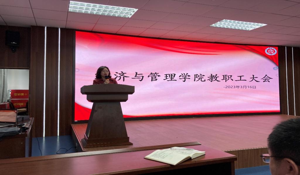 在求是楼517会议室召开了教职工大会,学院全体教职工参会。会议由院党委书记钟敏主持。