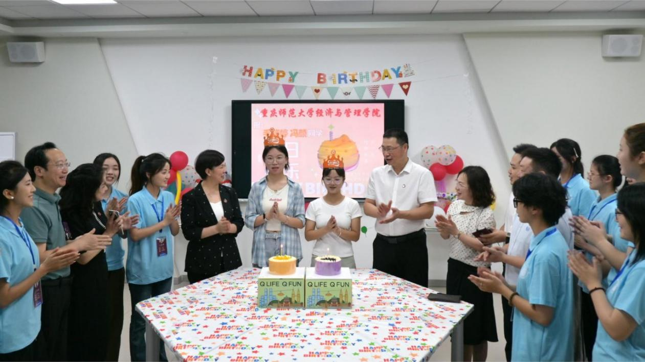 2024级本科新生毛瑞婷、冯颜同学的18岁生日。学院为这两位新生精心准备了生日庆祝活动,校领导们与同学们一起唱响生日歌,并为两位同学送上一份特别的生日礼物。张艳书记向两位新生表达了特别的祝福,并鼓励他们在新的人生阶段要奋力拼搏,立大志、明大德,通过大学阶段的学习锻炼,努力把自己培养成德智体美劳全面发展的栋梁之才。王国胤校长在讲话中强调,新时代的青年肩负着实现中华民族伟大复兴中国梦的重任,他鼓励新生们要把个人梦想与时代发展和国家需要结合起来,在勇敢追梦的过程中,不忘为国家的发展贡献力量,成为有理想、有担当的新时代好青年。