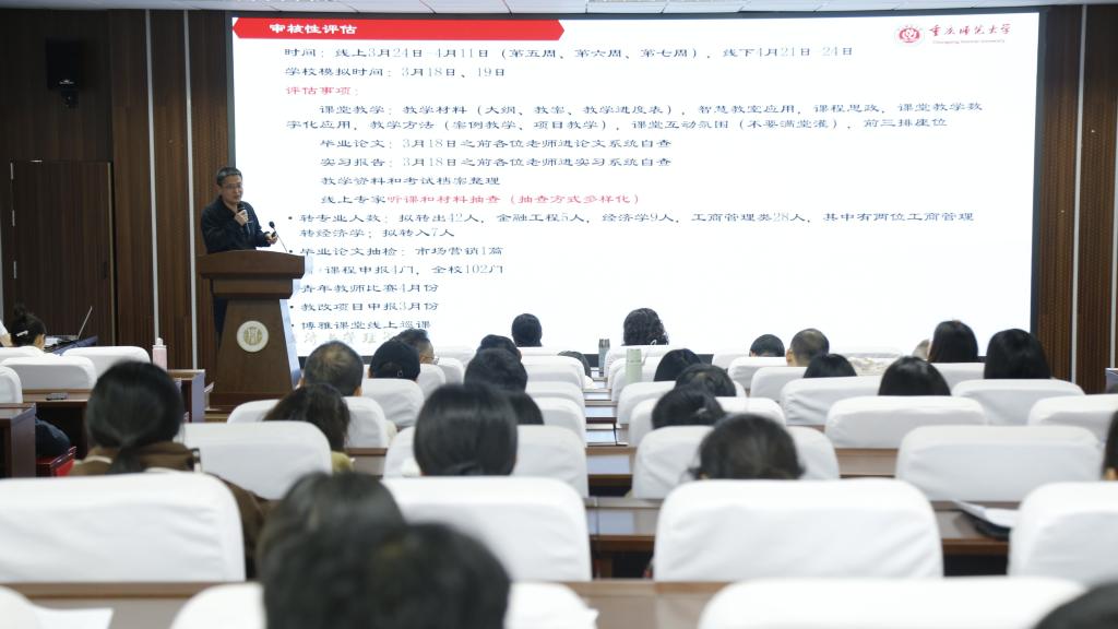 段俊副院长对本科教育教学审核评估展开应知应会培训。段院长强调,要落实“立德树人”要求,敦促教师们认真学习评估工作的具体要求,在教学中要注重教学内容、课程思政、教学方法及教学效果等关键环节,并积极在课堂实践中融入数字化教学手段。