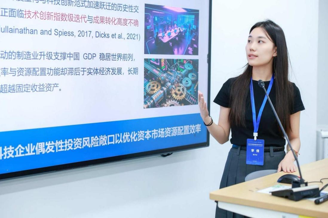 在分论坛汇报中,李倩同学以独特的“内部人信号释放-负面信息累积”双维度分析框架为基础,综合运用机器学习方法,深入剖析科技企业CEO减持行为与股价崩盘风险之间的传导路径及作用机制。其研究揭示了极端性投资风险的非结构化识别规律,并创新性地提出“制度约束-策略优化-技术赋能”三维治理框架。这一成果丰富了金融科技领域的风险研究体系,为科技企业构建了具有实操性的风险防控理论模型,也为监管机构和企业提供了切实可行的决策参考,得到现场专家学者的高度关注。