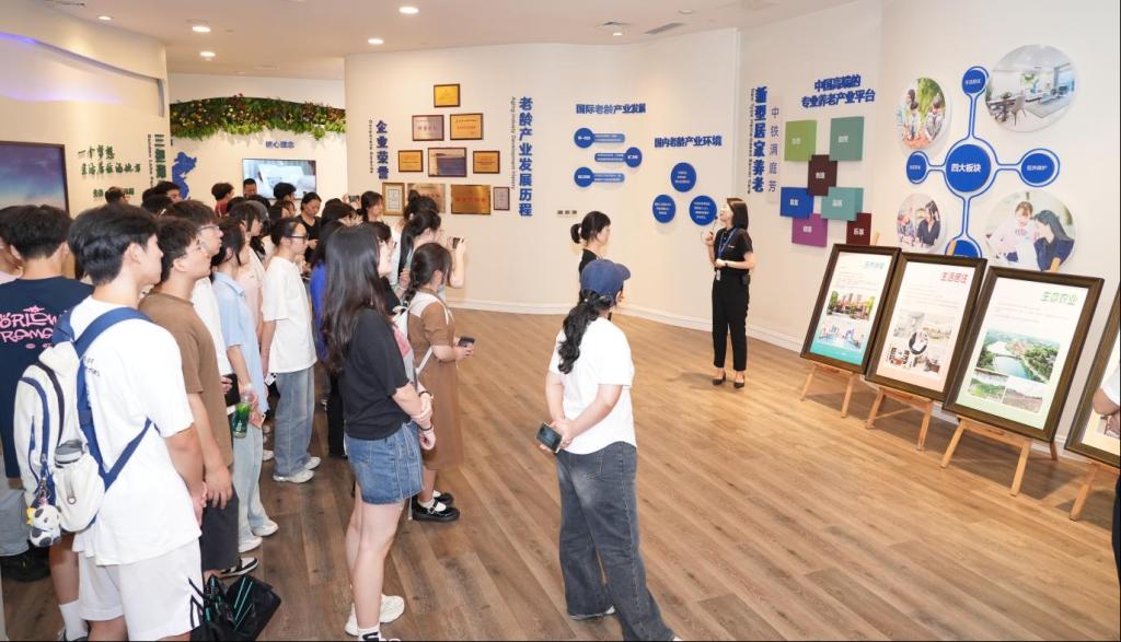 活动伊始,讲解员带着同学们走过项目展示长廊,生动讲解了集健康服务、科学膳食管理、多元社团活动于一体的全链条养老产业生态,并带领同学们实地参观了养老社区,从适老化设计的康养公寓、智能化的健康管理中心,到功能齐全的文娱活动场所。中铁任之以“农业+康养”为特色,开发了花果种植、水产品养殖及农副产品加工产业链,通过构建三级医疗服务网络,形成“预防—诊疗—康复”闭环。在老年住户洋溢着幸福笑容的脸上,同学们真切领略到现代养老产业数智化、精细化的运营模式。
