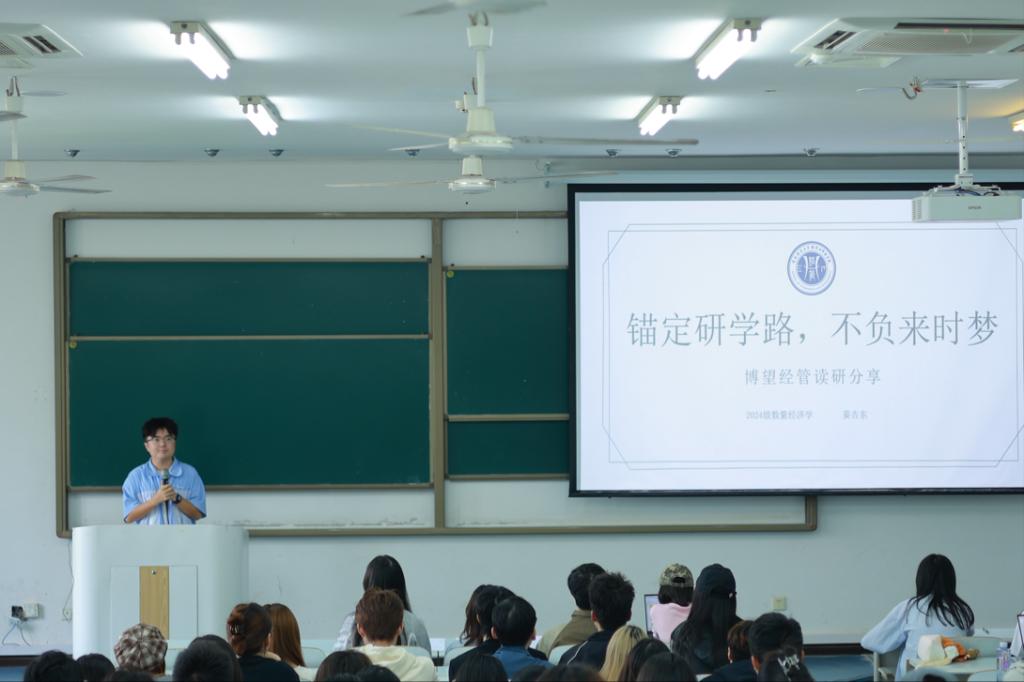 在图北楼17304教室成功举办第二十一届“博望经管·研究生论坛”。本次论坛邀请了2023级数量经济学专业吴坚、2024级数量经济学专业姜吉东两位同学分享,学院2024级全体研究生参与。