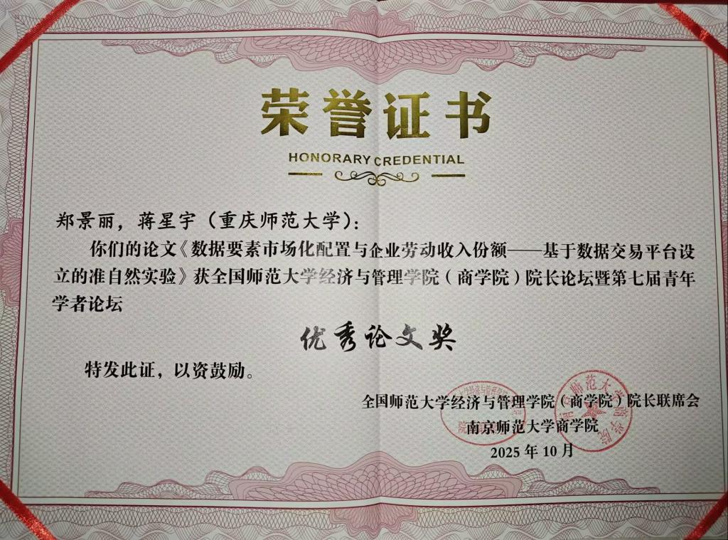 2024级企业管理专业研究生蒋星宇,其题为《数据要素市场化配置与企业劳动收入份额——基于数据交易平台设立的准自然实验》的论文汇报荣获本届论坛“优秀论文奖”。该研究基于2006—2023年中国A股上市公司面板数据,以各城市数据要素交易平台的设立为准自然实验,运用双重差分模型实证分析数据要素市场化配置对企业劳动收入份额的影响。该研究拓展了微观层面数据要素市场化配置效应的研究范畴,为政府优化数据要素市场配置政策和企业提升劳动收入份额提供了有益借鉴。