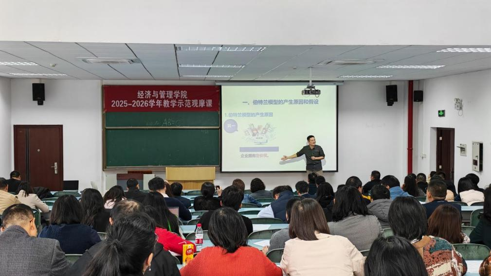 在求是楼421开展2025-2026学年教学示范观摩课活动。本次遴选了在2025年学校微课比赛获奖的王现宁和吕潮林两位老师为授课教师,活动由副院长段俊主持,学院全体领导班子成员及全体教师共同参与评课与教学交流。