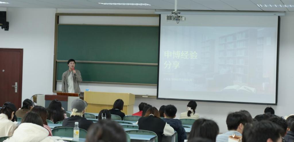 蔡扬同学重点从申博途径、目标院校选择及申请材料准备展开讲解:他解读了不同高校的入学要求,并结合自身经验,拆解了个人陈述、推荐信等核心材料的撰写要点,提醒同学们规避格式、内容等常见问题。李胤龙同学则聚焦导师选择与联系、申博时间规划及心态调整分享经验:他建议同学们结合自身研究方向精准匹配导师,规范联系流程,同时详细梳理了研二、研三申博各阶段的核心任务,为在场同学提供了切实可行的参考。