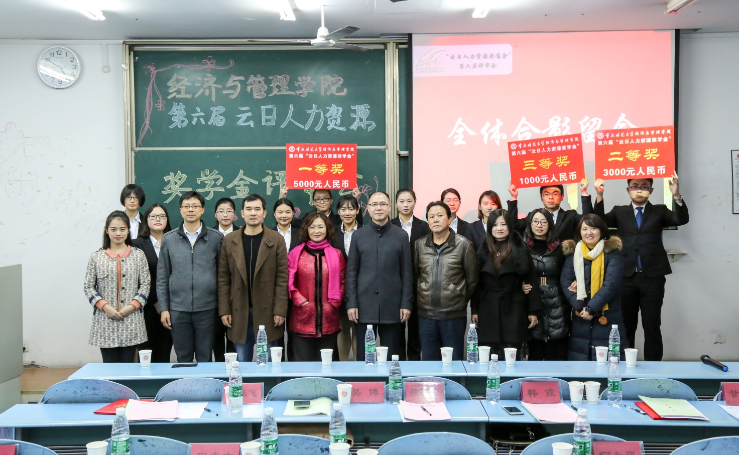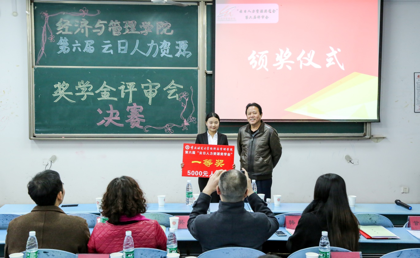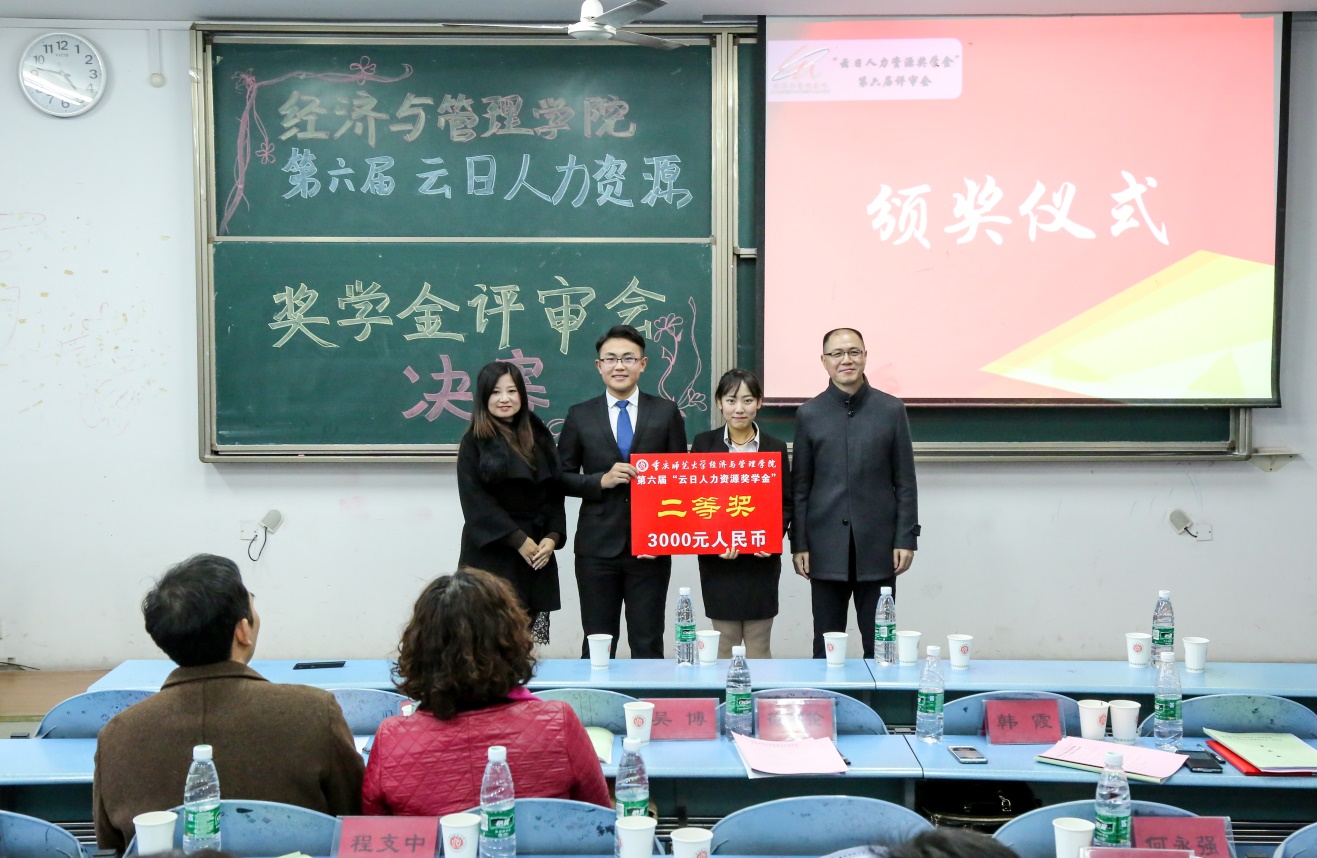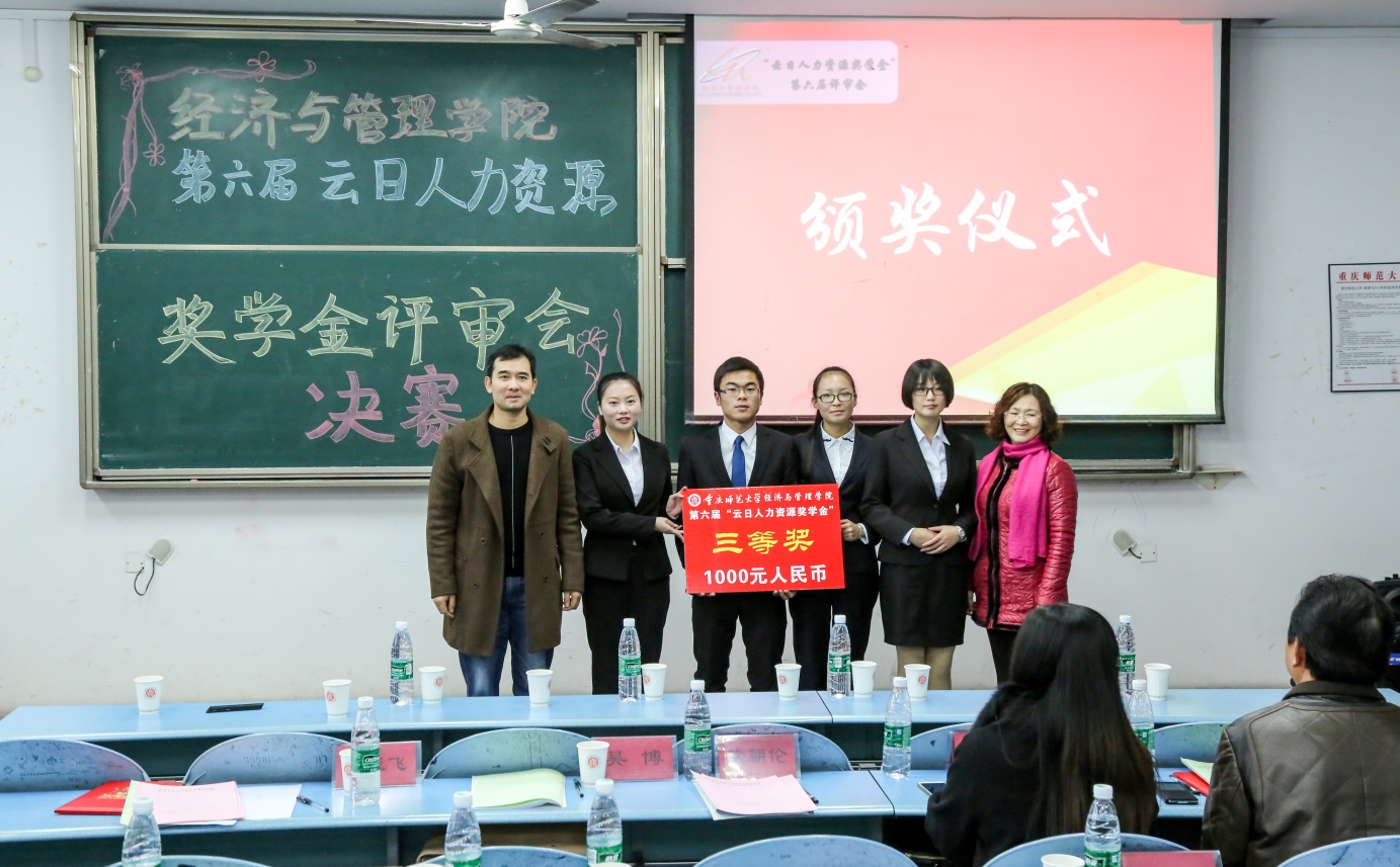 本次奖学金的评审分为自我展示、评审专家提问和评委打分三个环节。各位候选人在对自我介绍、学业成绩、实践能力、能力拓展、职业规划等几个方面进行自我展示、自我性格剖析和合理的职业定位,在言谈举止和机智辩答中彰显重师本色,展示经管风采。各评审老师也从语言流畅度、专业知识内涵、应变应答能力等方面进行考察并点明欠缺之处。在经过几番激烈的角逐之后,14级人力资源管理专业谯敏同学获得一等奖,14级人力资源管理专业高斯琴同学与14级工商管理专业邵明聪同学获得二等奖,涂云利、范文卿、马芸、冯庆同学获得三等奖,以上七名优秀学生成为云日人力资源奖学金的受益者。