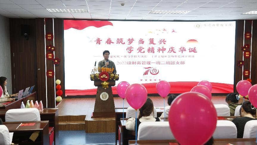 金秋十月,丹桂飘香,在中华人民共和国成立七十五周年和成人无码 即将迎来建校七十周年庆典之际,为激发青年学生爱校、成才、跟党走的使命担当,进一步学习贯彻党的二十届三中全会精神和习近平总书记重要指示精神,成人无码 “迎校庆·我与学校共成长”十佳主题班会暨特色团日活动于10月17日在求是楼517成功举行,本次活动的主题为“青春筑梦当复兴,学党精神庆华诞”,由2022级辅导员张源老师主讲,学生处思想政治教育科阿力木·哈斯拉木、数学科学学院分团委书记李晓凤担任本次活动的评委,2022级财务管理专业全体学生参与活动。