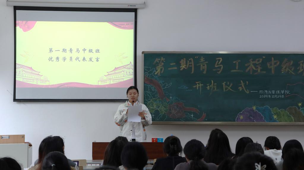 在齐唱中国共青团团歌后,张莉老师上台致辞,着重强调了青马工程的重要性和深远意义,表达了对同学们的殷切嘱托,希望大家在中级班能够深度研读马克思主义理论,既要继承前人的智慧结晶,又要保持自身独立思考能力,将所学到的理论知识转化为促进社会进步和发展的实际行动。