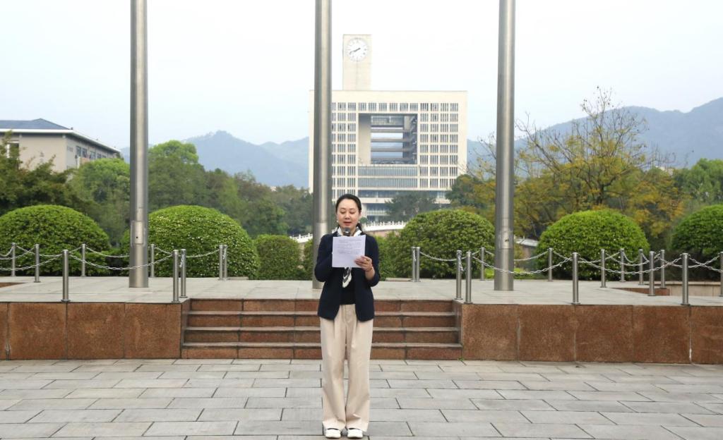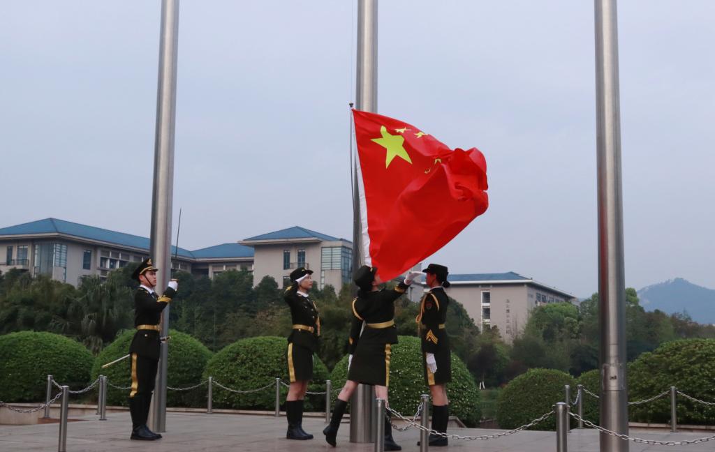 国旗护卫队带着青年人蓬勃的朝气,迈着整齐有力的步伐,目光坚定、神情肃穆地护卫国旗入场;随着国歌的奏响,鲜艳的五星红旗徐徐上升,全场人员庄严肃立,齐唱国歌,并以崇高的敬意向国旗行注目礼。随后,学院党委书记钟敏作国旗下的讲话。