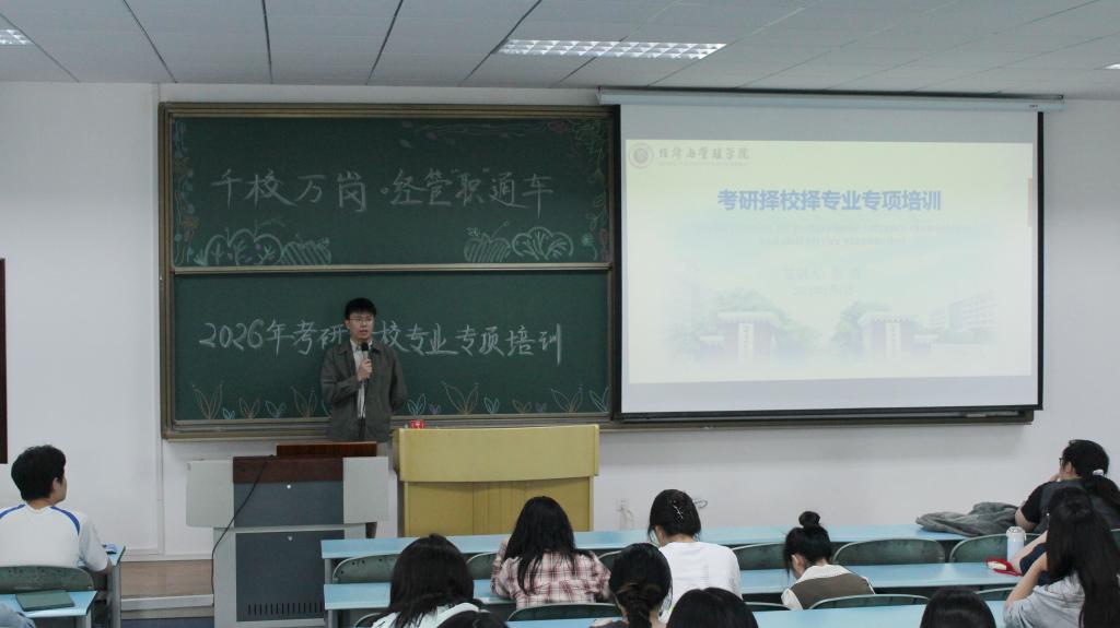 为进一步优化学风建设,助力2026届本科毕业生科学规划考研目标、精准把握备考方向,5月8日下午,成人无码 在求是楼421举办2026年考研择校择专业专项培训。本次培训会由2022级辅导员张源老师主讲,140余名意向考研同学的参会。