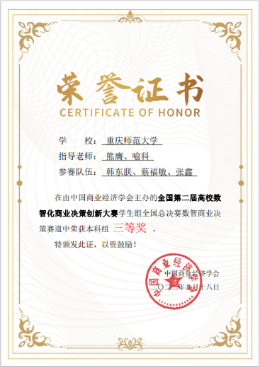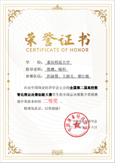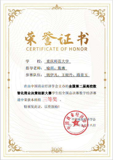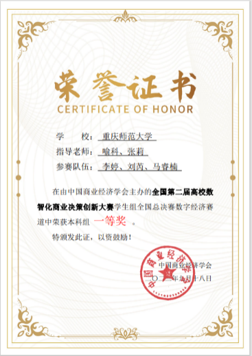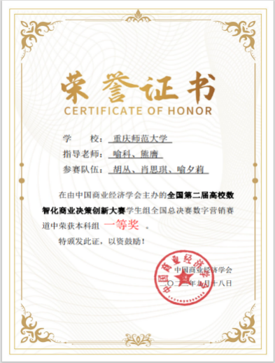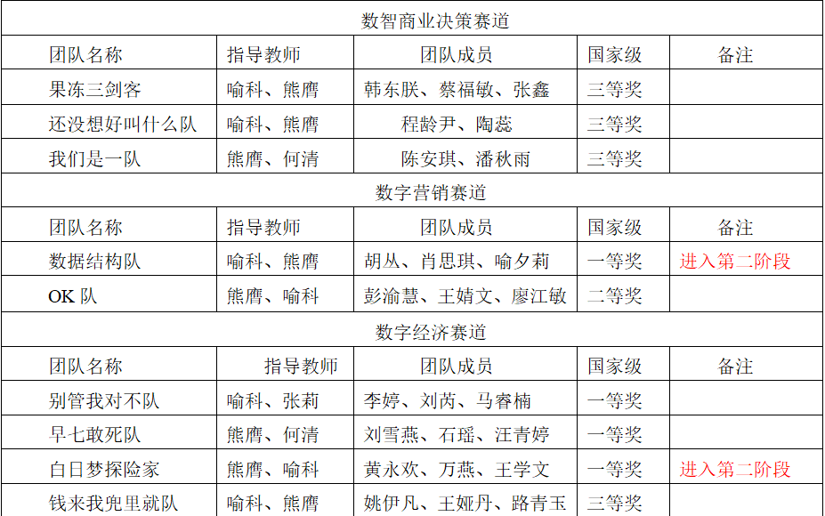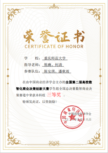 学生共获得国家一等奖4项、二等奖1项、三等奖4项。此项赛事分为三个赛道:数智商业决策赛道、数字营销赛道、数字经济赛道,根据竞赛晋级规则,决赛第一阶段竞赛成绩排名靠前的20支团队获得进入全国总决赛第二阶段“数智职业实战”环节,该环节以答辩形式进行,评委与参赛队伍双向匿名,抽签方式全程加密。成人无码