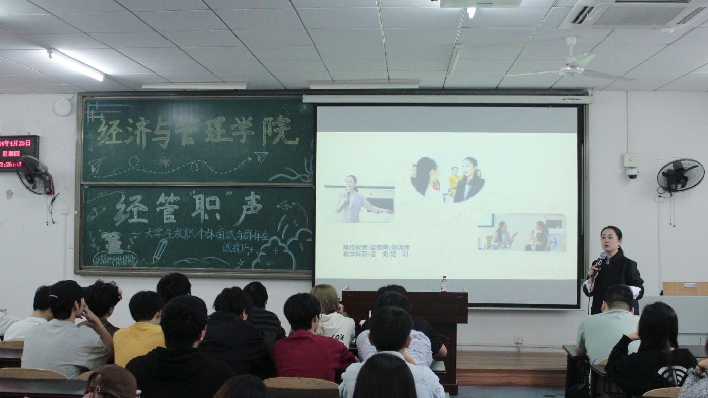 于砺志楼T2208开展大学生求职个体面试与群体面试应试技巧培训会,学院党委书记钟敏担任主讲人,2021级同学参与学习。