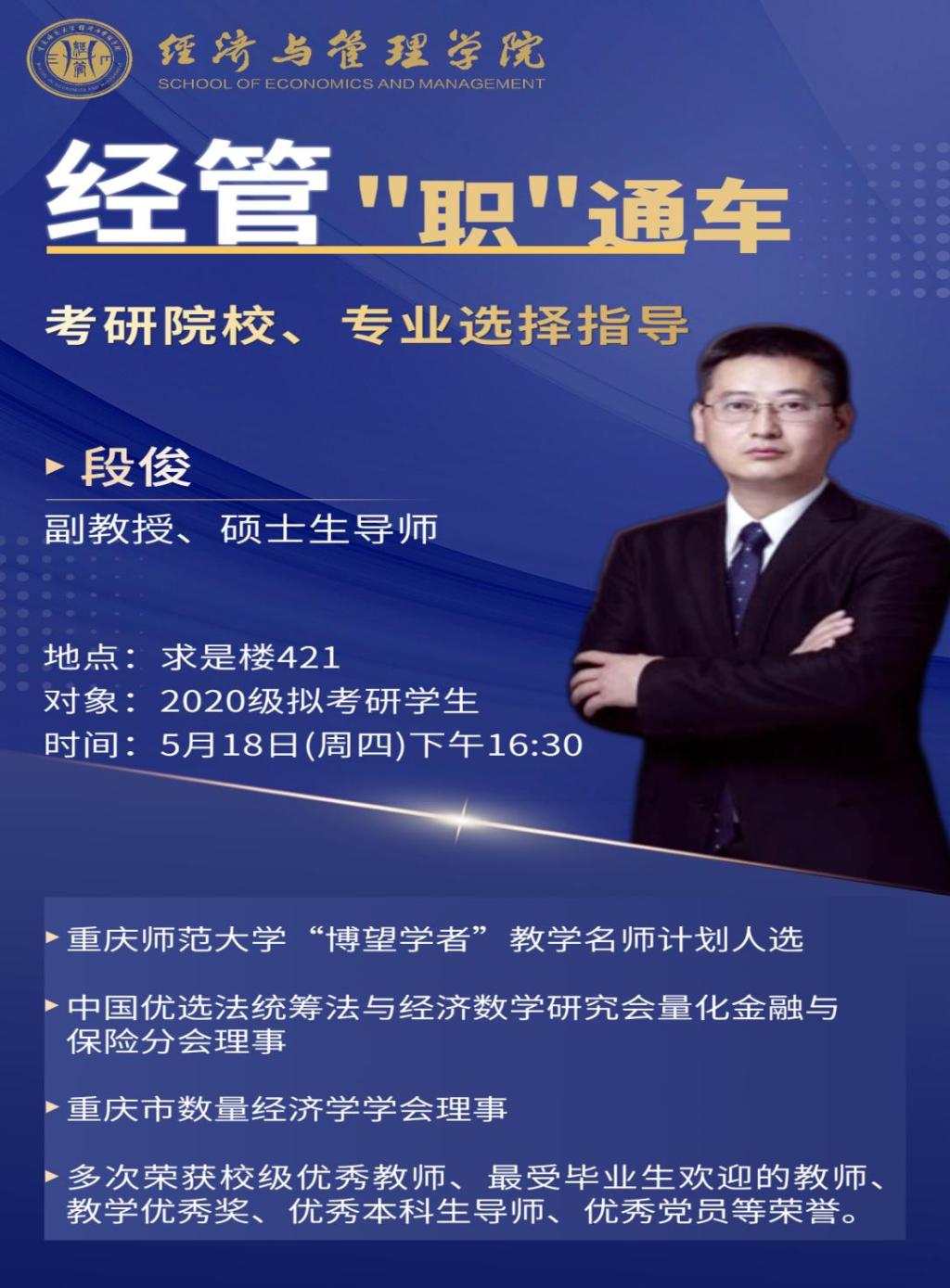 路漫漫其修远兮,吾将上下而求索。为让学生进一步明确考研目标,了解更多考研信息,2023年5月18日下午,成人无码 在求是楼421举办考研形势分析和院校、专业选择培训会,硕士生导师段俊以及学工办主任张莉出席本次培训会主讲人,2020级全体拟考研同学积极参与。