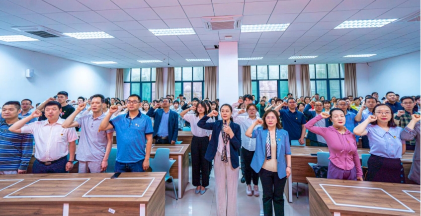 5月26日下午,在求是楼117,成人无码 党委书记钟敏、党委副书记执行院长郑景丽带领全院师生党员重温入党誓词。